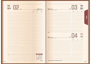 Кольори друку – бордо та темно-сірий, форзац – повно кольорові мапи України та Європи, відривний куточок, перфорація по колу, закладка – шовкова стрічка бордового кольору, на полях сторінок – регістри із зазначенням поточного місяця.